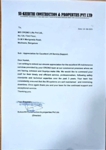 I would like to take a moment on behalf of our Management Committee to sincerely thank you and your team for the outstanding lift maintenance services you have consistently provided in our apartment over the past one and a half years. Your quick response times, attention to detail, and dedication to safety have played a vital role in the smooth operation of our two lifts. We especially appreciate your proactive approach in spotting potential issues before they become problems, as well as your professionalism in handling maintenance tasks with minimal disruption to our community. Please pass on our gratitude to your entire team for their dedication and hard work. We look forward to continuing our partnership and maintaining the high standards we have come to expect from your services.